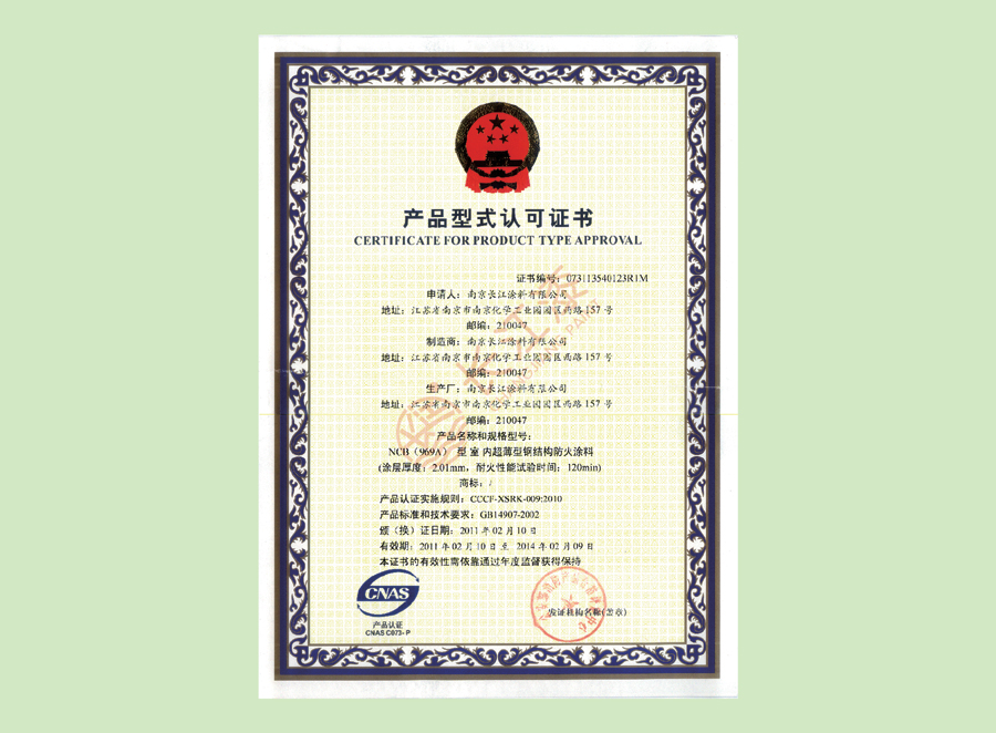 - 防火涂料产品型式认可证书
