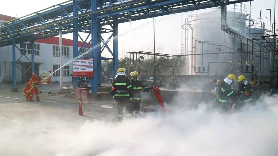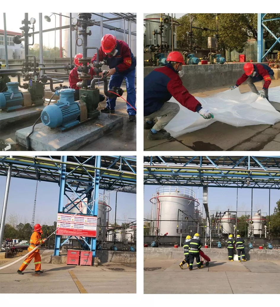 本次演练由堵漏、灭火及逃生三个方面构成。模拟情形为储罐区打料泵出现二甲苯泄漏并进一步引发火情,公司立即启动应急响应程序,迅速成立应急抢险组、污染控制组、后勤保障组、医疗救护组、警戒疏散组。5个小组按照应急预案参与事故处置工作,圆满完成了演练设置的各项作战任务。本次演练总用时45分钟,演练过程急而不乱,各参演人员分工明确,作战任务清晰,战斗行动迅速,协同配合密切,达成预期目标。