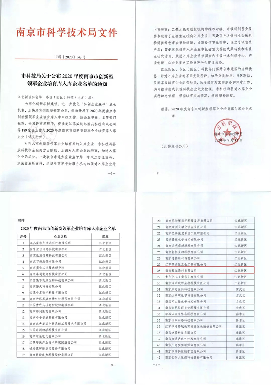 近日,南京市科学技术局公布了“2020年度南京市创新型领军企业培育库”入库企业名单,长江涂料荣幸入选。